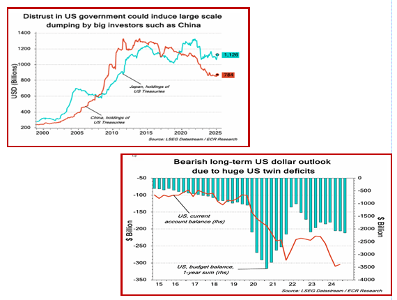 Still, foreign trust in the US and confidence in management is falling. It’s taken as a given now that foreigners will continue to remove their investment in Treasuries. See the chart. This is due not just to Trump’s bad behavior but to the real and growing current and federal deficits. A less-bad increase on the fiscal side, even if we were to get such an unlikely outcome, will not change enough to change sentiment.