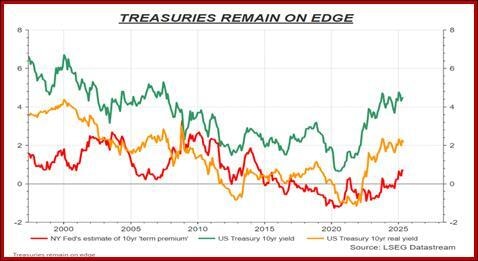 Yields keep rising. See the chart from Reuters. This reflects the rising risk premium required by investors in the face of probably rising inflation, a rising deficit, and general dislike of everything the US government is doing these days. We expect the correlation to be higher yields, higher dollar, but not this time.