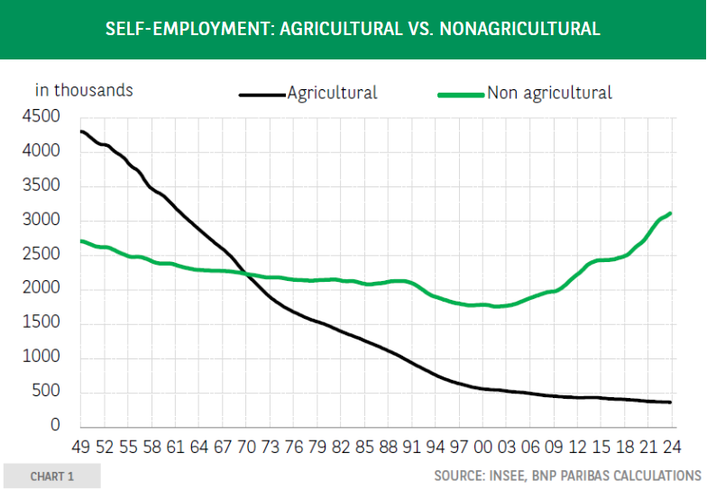 According to INSEE statistics, at the end of the 1940s, there was one self-employed person for every two salaried employees, a ratio that was close to one in eight in Q4 2023, after falling below one in 10 in the early 2000s. However, this image is strongly biased by the major weight of agriculture in the immediate post-war period. The sharp decline in the sector explains that there are now fifty per cent fewer self-employed jobs than at the end of the 1940s (when statistics began).