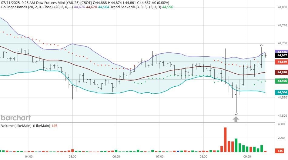 On Friday the ZT dived Lower at around 9 AM EST with no eco news pending. The Dow leapt Higher at the same time. Look at the charts below and you'll see a pattern for both assets. The Dow climbed Higher at 9 AM EST and the ZT dived Lower at around the same time. These charts represent the newest version of Bar Charts, and I've changed the timeframe to a 15-minute chart to display better. This represented a Short opportunity on the 2-year note, as a trader you could have netted about a 12 plus ticks per contract on this trade. Each tick is worth $6.25. Please note: the front month for ZT is now Sep '25 and the Dow is now Sep '25. I've changed the format to filled Candlesticks (not hollow) such that it may be more apparent and visible.