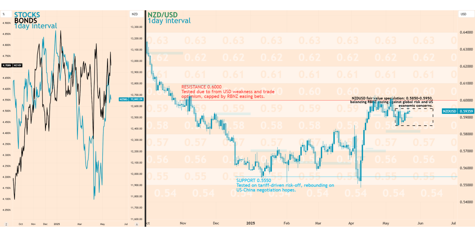 Right now, the New Zealand market is dealing with a mix of government policy changes and economic pressures from overseas. The biggest news is the government's Budget 2025, announced on May 22nd, which looks like it means tighter spending. This is happening just as the Reserve Bank (RBNZ) is expected to cut interest rates on May 28th. On top of that, there’s global nervousness about US money issues, especially after Moody's downgraded their credit. But some good news for New Zealand is our exports, particularly dairy, are doing really well – dairy exports jumped 38% in April compared to last year, giving us a nice trade surplus. So, there's a lot going on for the Kiwi dollar.