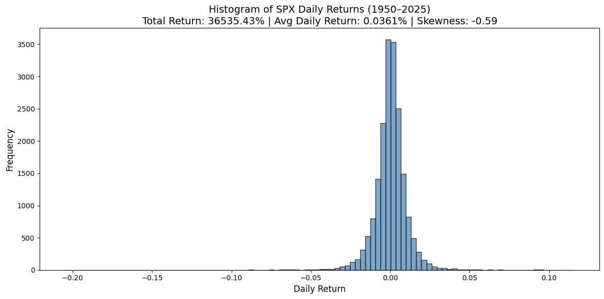 In plain English: while the market has gone up over time, its biggest daily moves have mostly been down, not up. The left tail of the return distribution—the crash side—is fatter than the right.