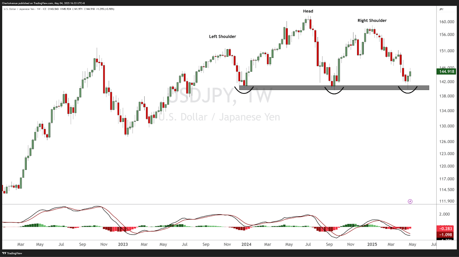 A look at the weekly chart of the USD/JPY shows a well-defined head and shoulders pattern developing. This is typically a bearish reversal setup, suggesting that sellers are attempting to turn the broader trend lower.