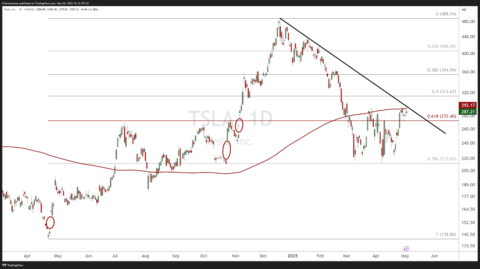 The daily chart of Tesla (TSLA) highlights a rebound from the 78.6% Fibonacci retracement level of its April to December 2024 uptrend. During this pullback, the price was able to close two previous gaps (red circles).