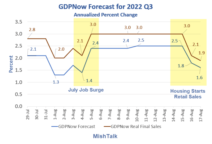 The GDPNow model estimate for real GDP growth (seasonally adjusted annual rate) in the third quarter of 2022 is 1.6 percent on August 17, down from 1.8 percent on August 16. After this morning's retail sales report from the US Census Bureau, the nowcast of third-quarter real personal consumption expenditures growth decreased from 2.7 percent to 2.4 percent.
