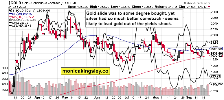 S&P 500 and all its sectors slid yesterday without as much as a brief visit to 4,420s at the open – straight down through yesterday given 4,385 premium level, with Russell 2000 showing no signs of life. 10y yield of 4.50% has been reached, risk assets repricing is underway, and this is how I view the upcoming yield path, including it being only recession that can bring yields down somewhat. And given the goldilocks economy and the discussed elements behind the rise in yields – BoJ yield curve control (no move today there really), hawkish clarity of Powell‘s intentions, and returning inflation, are all set to make a Nov rate hike have better odds than a coin toss (there is still one more hike this year coming).