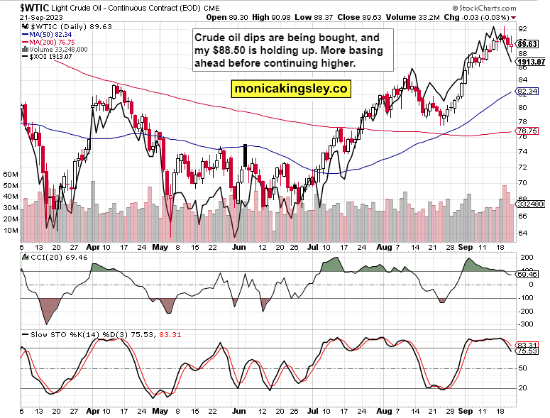 Gold would have much trouble rising with such rates, but given that the dollar top is as many weeks away as things start to break (concern chiefly for 2024), I would be patient about signs of decoupling from yields emerging. For now, I‘m not counting on $1,960 early next week, yet silver is likely to defend $23.70 on a closing basis today. Copper did test the lower support of $3.65, and will have trouble overcoming $3.75 again. The red metal belongs among the more vulnerable ones post FOMC.