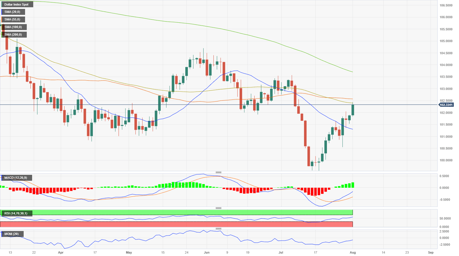The US Dollar Index arrives at the meeting enjoying its strongest two weeks since May and recovering from one-year lows. The DXY has risen back above 100.00 and is testing the 20-week Simple Moving Average (SMA) which stands around 102.50. Around that level, the 55- and 100-day SMAs are also spotted. A break higher would improve the outlook for the Dollar, suggesting that the recovery is sustainable.
