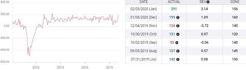 Private payrolls from Automatic Data Processing (ADP) added 291,000 positions in January in the highest monthly total since May 2015, far above the 156,000 predicted by economists in the Reuters survey. The increase follows December’s strong gain of 199,000 which was revised lower by 3,000 and suggests that though the unemployment rate of 3.5% is a five decade low, there is still labor slack in the economy.