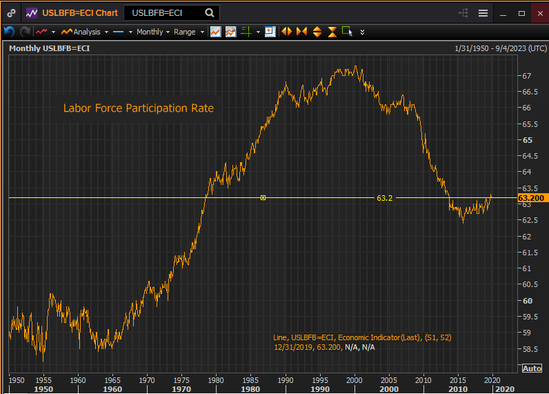 The decline is partially the result of the natural aging of the US population as older people work at lower rates but there was likely a discouragement factor at play as well, especially in the immediate aftermath of the financial crisis when employment in many fields was very hard to find.