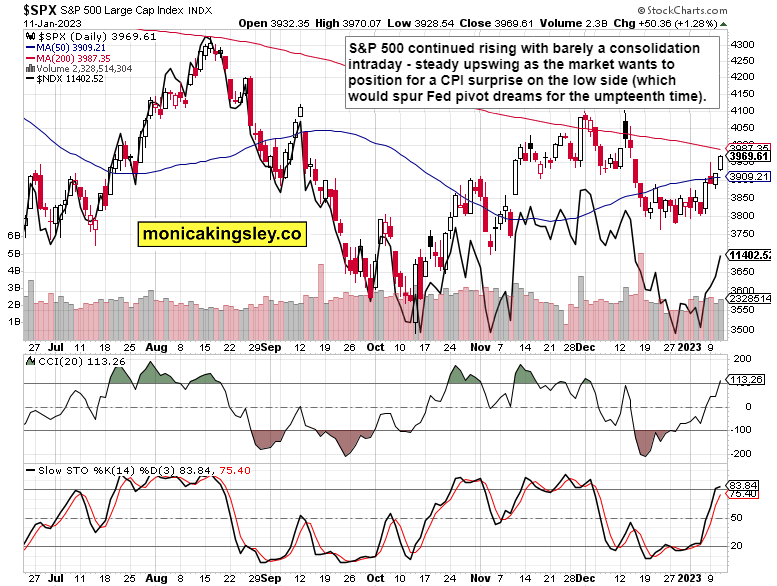 S&P 500 continued reversing the Powell fears after the Swedish nothingburger with barely a consolidation. The consensus is for a very low CPI figure, quite well even undershooting the 6.5% mark. I‘m a bit more wary, and thinking 6.6 – 6.7% is more appropriate, and that the core figure would prove particularly sticky. Enough for the Fed to be unforfortable too, and definitely not give up hiking before Fed funds rate makes it to my (at the moment both realistic and conservative assessment of) 5.50% level – level which the Fed may over time find as not restrictive enough.