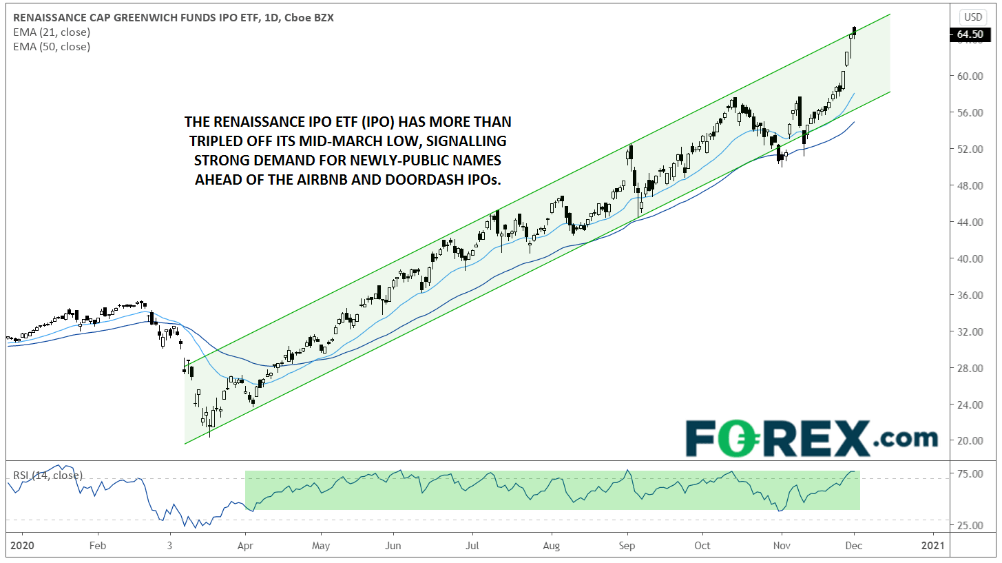 One factor supporting ABNB’s valuation has been the staggering rally in recent IPOs more generally. Some readers are no doubt familiar with the big moves in Snowflake, Inc (SNOW) and Palantir Technologies (PLTR), but the excitement around IPOs has been broad and widespread over the last eight months. For example, the Renaissance IPO ETF (IPO) - featuring top holdings such as Moderna (MRNA), Uber Technologies (UBER), Zoom Video (ZM), and Pinterest (PINS) – has more than tripled off its mid-March low:
