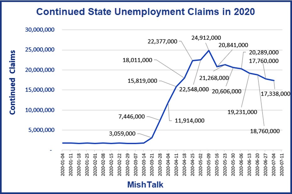 State continued claims dipped slightly to 17.338 million but have remained above 15 million for 13 weeks.