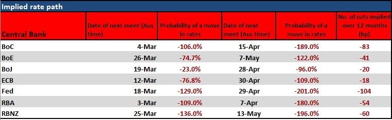 We can look at the rates markets and see some punchy expectations being priced into markets and we’re not just talking 25bp, but in Canada, Australia, NZ and the US, we’re seeing the possibility of a 50bp cut – and that is not insurance. I felt things had perhaps gone too far, but the fact that the ECB president Christine Lagarde has just detailed that “we stand ready” to take appropriate steps, suggests that this really is a coordinated stance from central banks. Throw in likely OPEC measures this week to address supply, and governments addressing fiscal stimulus, and you have a united front that is aimed at addressing financial conditions.