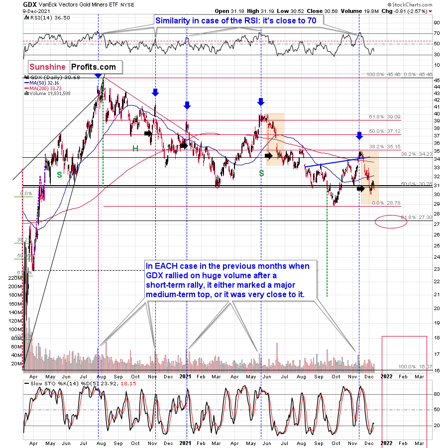 As far as the November lows are concerned, while it might not be 100% clear based on the above chart, it is the case that the lowest daily close in November was $31.53, and yesterday, the GDX ETF closed the day at $31.49. As the daily closes are more important than the mid-session candlestick closes, I don’t view the breakdown below the November lows as invalidated.