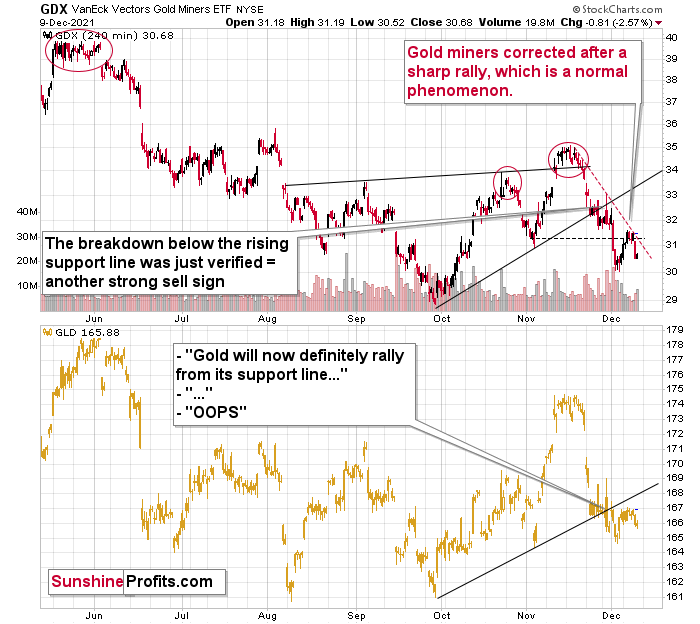 As further evidence, the GDX ETF’s 4-hour chart is also sending ominous signals. For example, after running into its declining resistance line (the red dashed line on the right side of the chart below), the senior miners’ momentum fizzled, and a sharp decline followed.