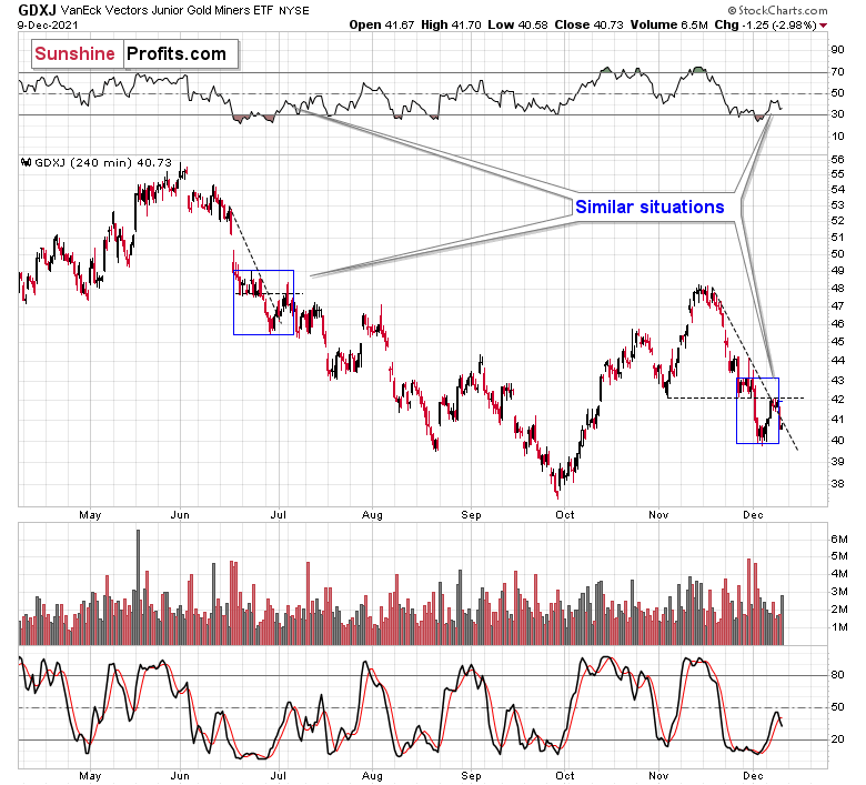 One of the previous situations that’s similar to the current one is what we saw right before the mid-year top. I marked mid-year declines (from the start to the first more visible correction) in both charts: GDX and GDXJ with orange rectangles. If the history repeats itself, both proxies for mining stocks could move back to their previous 2021 lows before correcting.
