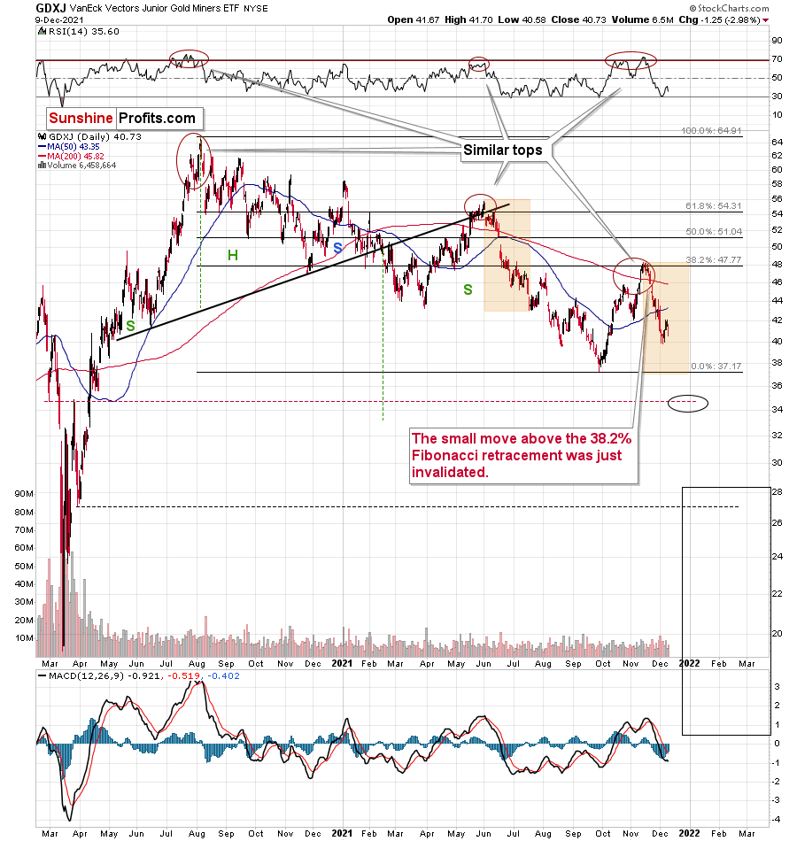 Showcasing similar weakness, the GDXJ ETF also reversed sharply after slightly breaking above its declining resistance line (the black dashed line on the right side of the chart below). The invalidation of the breakout served as a strong sell sign, and it’s no wonder that junior miners declined by almost 3% yesterday.