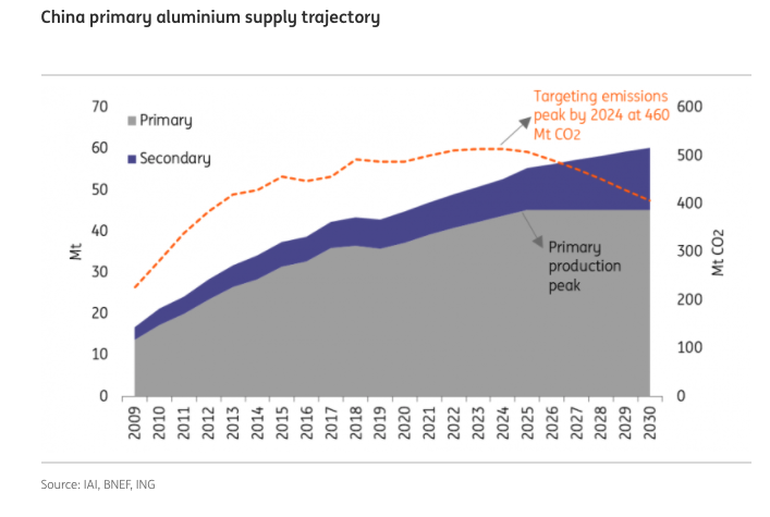 China’s primary supply growth is set to plateau. China is under pressure to bring down carbon dioxide emissions from primary aluminium smelting and ING thinks capacity could be capped under 45 million tonnes. The upshot is that secondary aluminium capacity has to take up the slack.