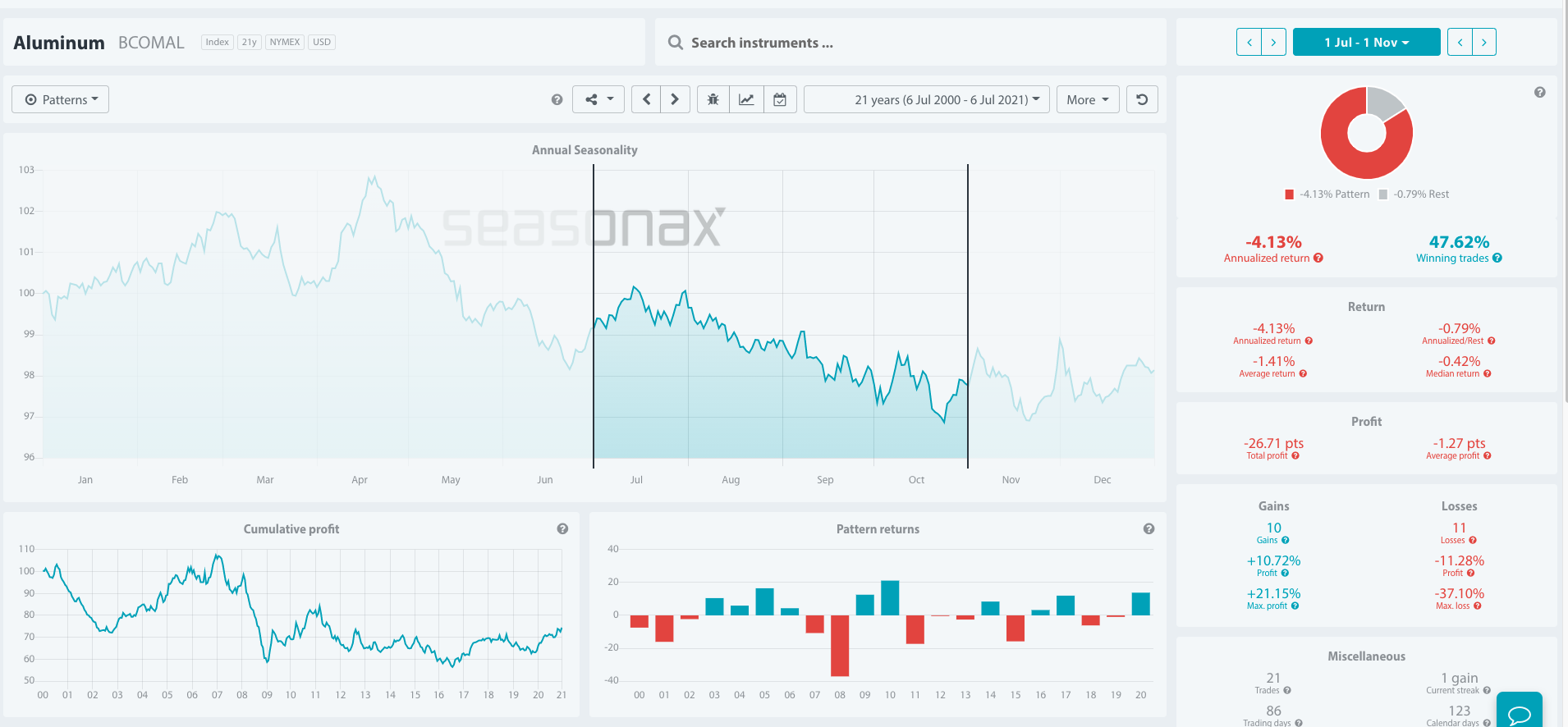 The seasonal buying and selling of aluminium do not provide much helpful information apart from revealing that in the last 21 years between July and November prices have fallen 11 times and gained 10 times. The largest gain was in 2010 with a 21.15% gain and the largest loss was in the global financial crisis of 2008 with a -37.10% loss. This shows a balanced picture overall and means that supply and demand issues should take precedence over driving prices.