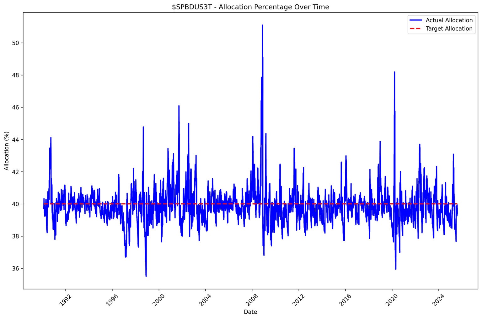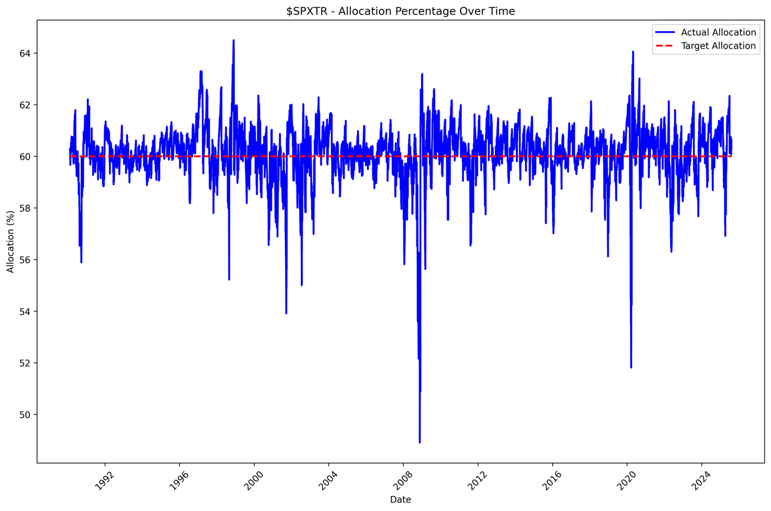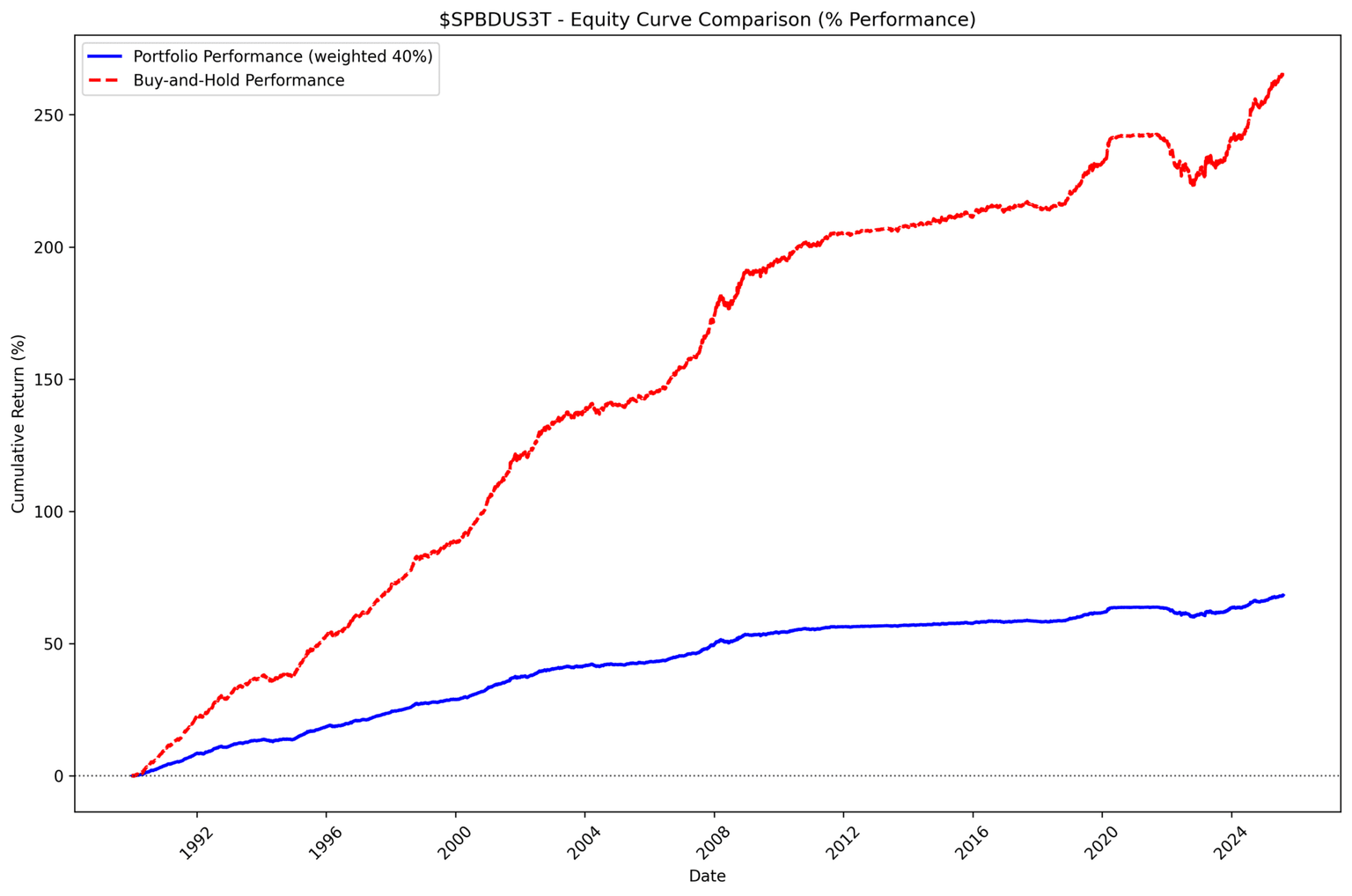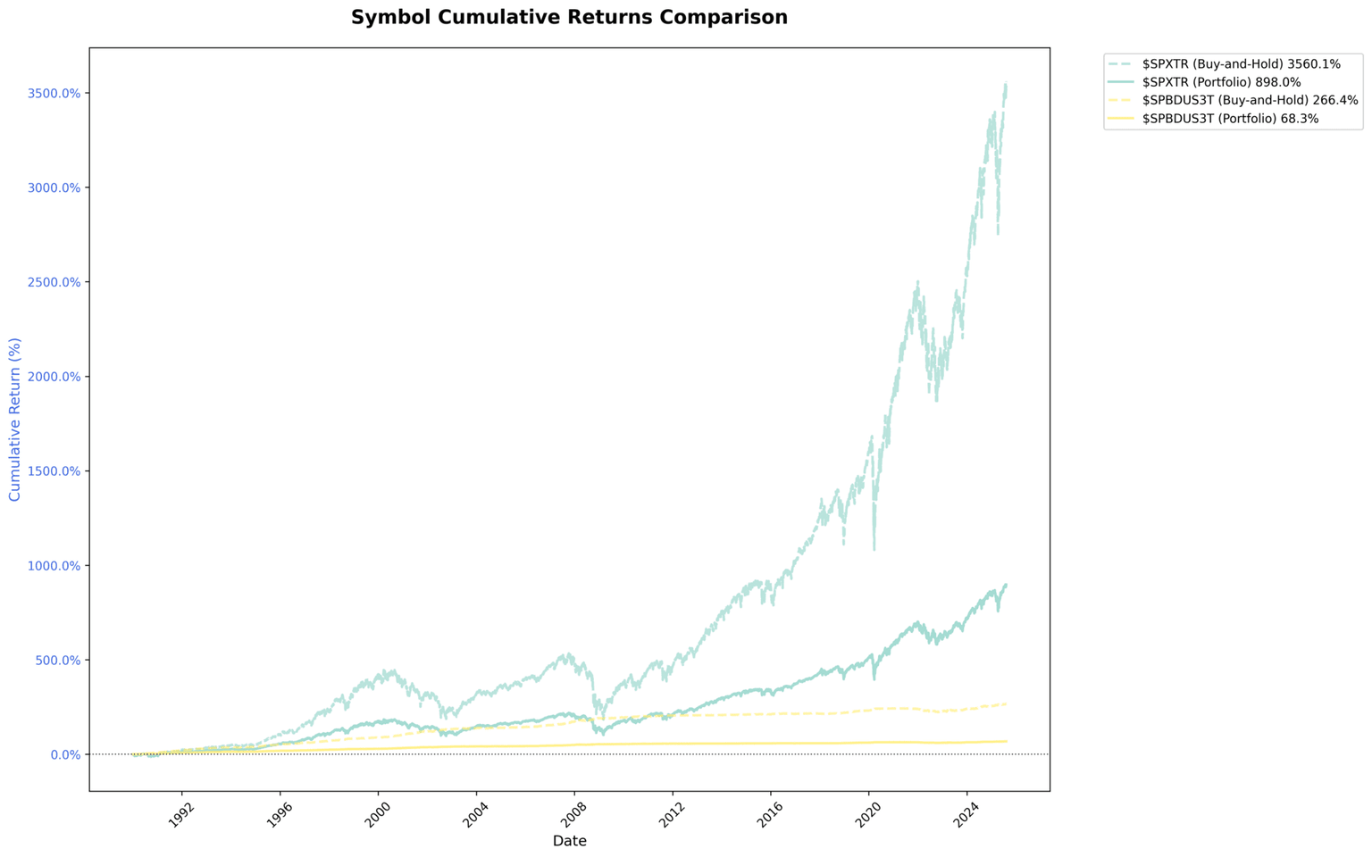 From 1990-01-02 to 2025-08-08 (35 years), the 60/40 strategy that rebalances every month produced a 947% total return versus the S&P 500 Total Return benchmark of 3560%. The only thing going for the strategy is that it has a higher Sharpe Ratio of 0.78 versus 0.65, definitely not worth the sacrifice.