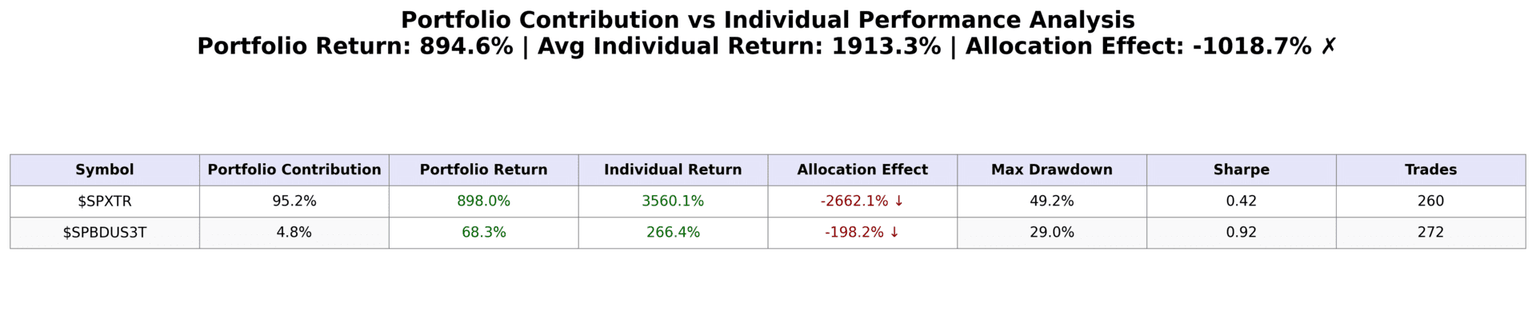 In this chart you can see the individual symbol contribution from each symbol. If it was a buy and hold on its own or as part of the portfolio. 95% of the return is coming from the S&P 500, which is clearly doing all the heavy lifting, and one therefore needs to ask the question if the bond returns are doing enough.