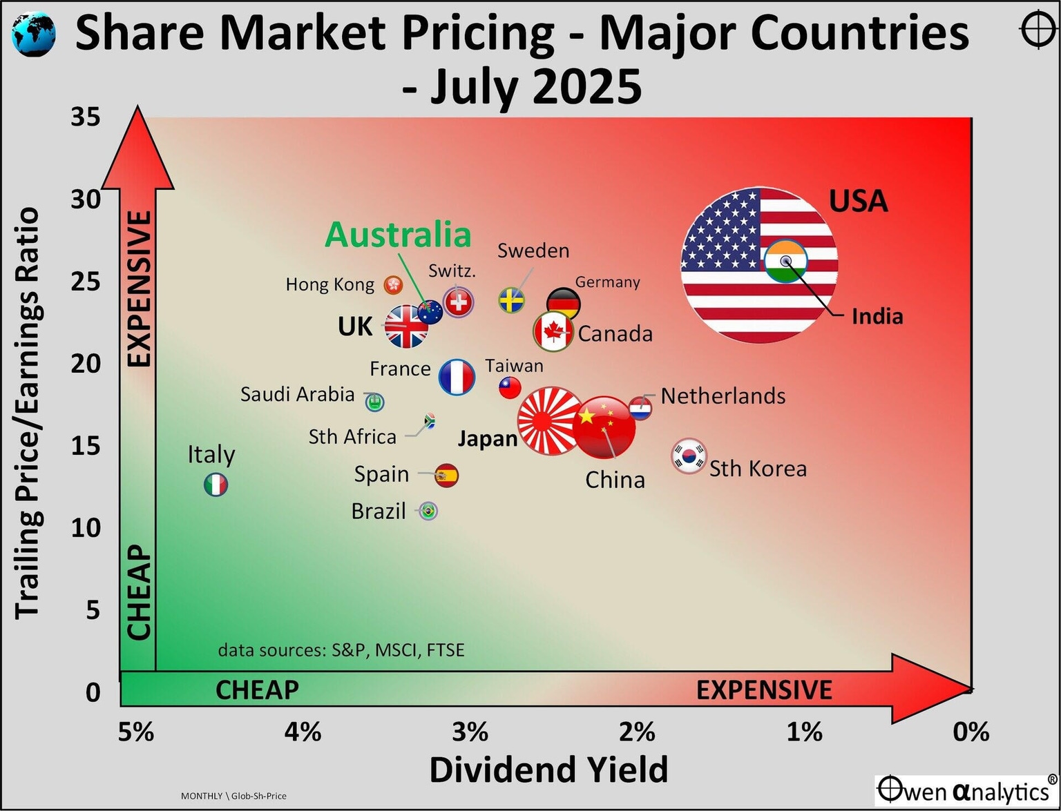 There are world stock markets remain extremely expensive. Here are 2 different charts saying the same thing. This chart is produced by Owen Analytics an excellent resource for in-depth research.