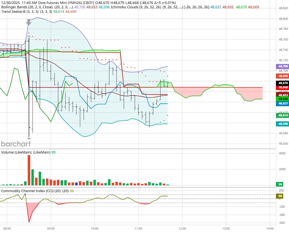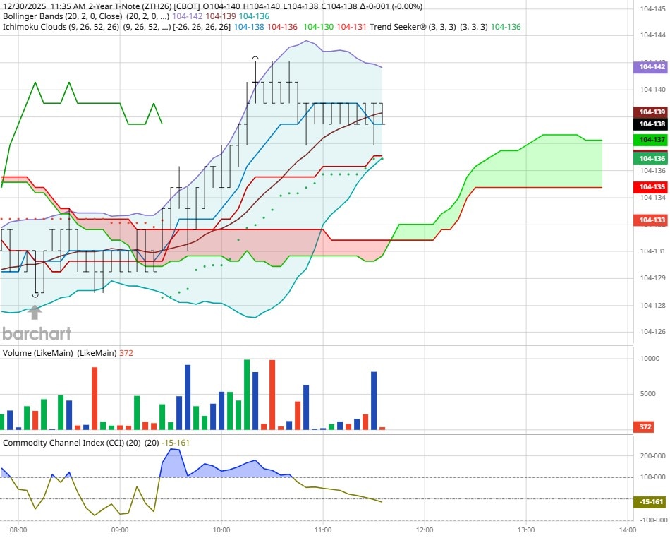 Yesterday the ZT climbed Higher at around 8:30 AM EST with no real news items pending at that time. The Dow dived Lower at around the same time. Look at the charts below and you'll see a pattern for both assets. The ZT climbed Higher at around 8 AM EST and the Dow dived Lower at around the same time. These charts represent the newest version of Bar Charts, and I've changed the timeframe to a 15-minute chart to display better. This represented a Long opportunity on the 2-year note, as a trader you could have netted about a dozen ticks per contract on this trade. Each tick is worth $6.25. Please note: the front month for the ZT and YM are both Mar '26. I've changed the format to filled Candlesticks (not hollow) such that it may be more apparent and visible.
