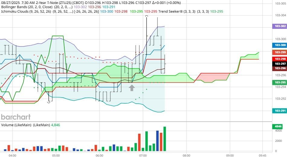 Yesterday the ZT climbed Higher at around 7:30 AM EST with no news pending. The Dow dived Lower at the same time. Look at the charts below and you'll see a pattern for both assets. The Dow dived Lower at around 7:30 AM EST and the ZT climbed Higher at around the same time. These charts represent the newest version of Bar Charts, and I've changed the timeframe to a 15-minute chart to display better. This represented a Long opportunity on the 2-year note, as a trader you could have netted about a dozen plus ticks per contract on this trade. Each tick is worth $6.25. Please note: the front month for ZT is now Sep '25 and the Dow is now Sep '25. I've changed the format to filled Candlesticks (not hollow) such that it may be more apparent and visible.