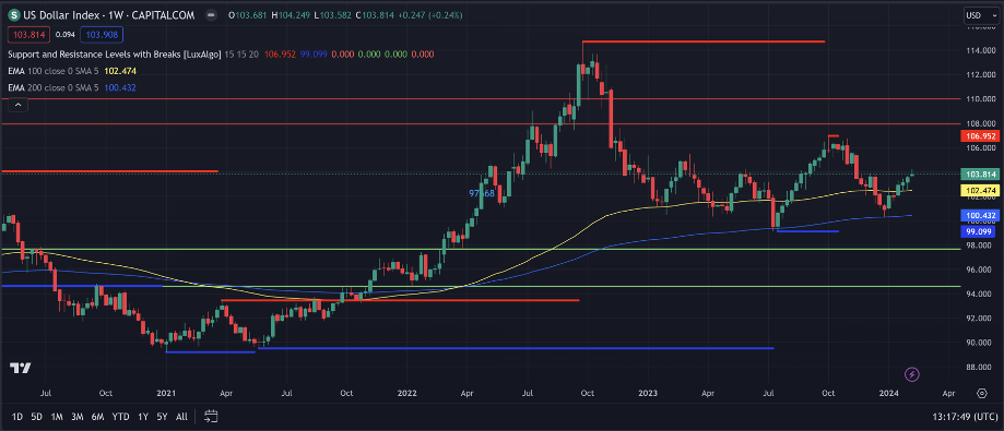 Last week, the US Dollar Index displayed mixed signals, reflecting nuanced market sentiment. While the candlestick closed above its open, resembling a small bearish pin bar, the weekly close indicated an upward trajectory compared to prices from 3 and 6 months ago, suggesting a bullish long-term trend. However, the direction remains uncertain, hinging significantly on the upcoming release of US CPI (inflation) data.