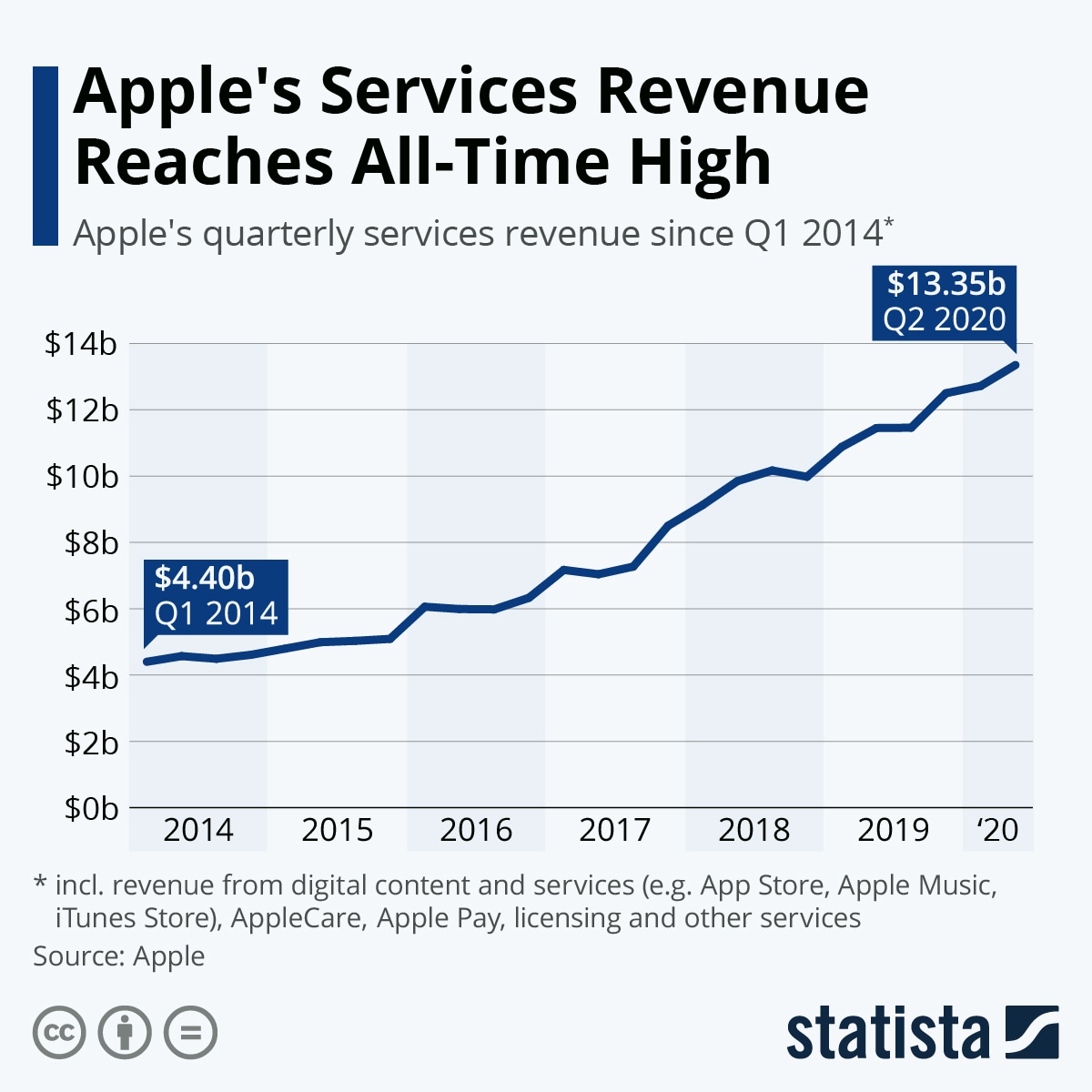 Apple has been placing a huge emphasis on services in the last few years. This is evident from the fact that services contributed $13.3 Billion in Apple’s Q2 revenue, an all-time high. iPhone sales have in a slump since 2015 due to an increase in competition.
