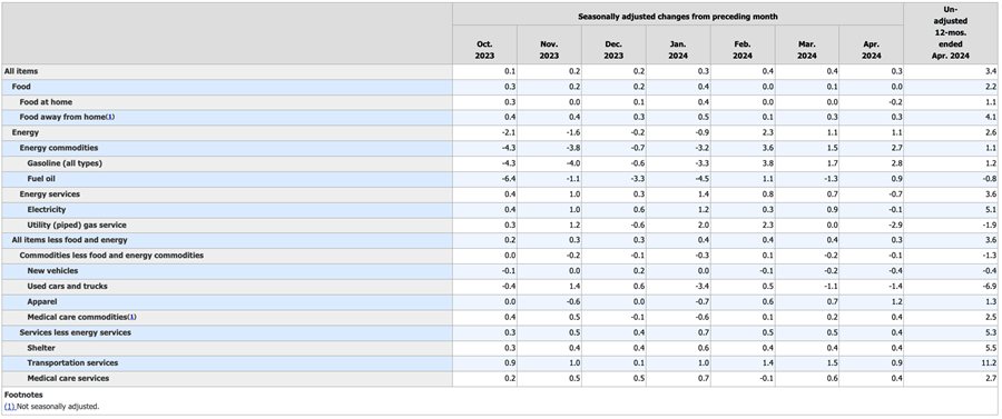On an annual basis, prices rose 3.4 percent in April according to the Bureau of Labor Statistics (BLS) data. That was down just a tick from the 3.5 percent reading last month and met expectations. To put it in a little broader context, the annual CPI print was 3.2 percent in February and 3.1 percent in November.