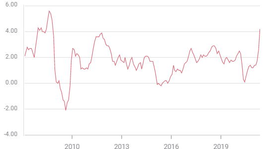 - US CPI inflation has tripled to 4.2% in the four months to April.