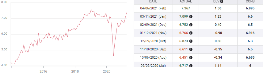 The Employment Index for the service sector rose to 55.8 in April from 57.2. It had been forecast to drop to 55. Here also, the 53.9 average this year is the highest since mid-2019.