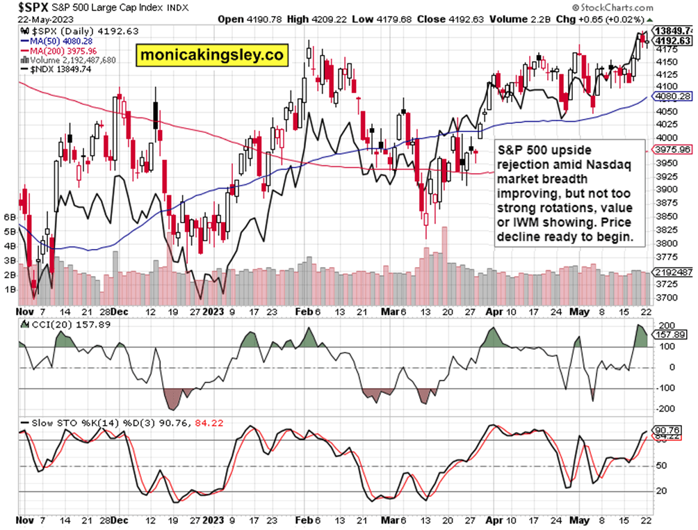 S&P 500 rejected further upside, and is ready for correction within this upswing – the correction characteristics would determine the path forward as hearing Bullard talk two more rate hikes wasn‘t something the market had discounted. 2y yield rose to 5.40% , and 10y is above the midpoint of its recent range at 3.72% - yet stocks are holding up so far, and especially tech, Big Tech is ignoring the glaring disconnect to TLT – these two usually go hand in hand, but GOOGL, MSFT and AAPL with NVDA are still holding up. Talking the last two, there is some short-term technical vulnerability (as in suspect series of latest daily candles) showing up, and I wonder how much more nosebleed for NVDA can come following its earnings tomorrow after the close.