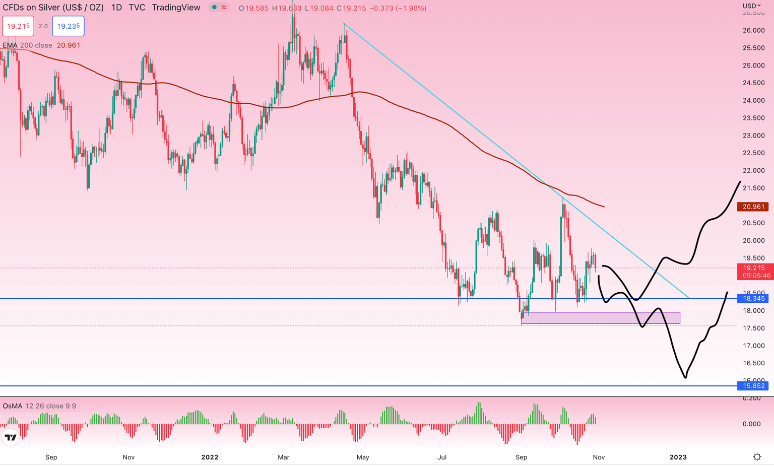 As gold created several lower highs and lower lows, it is signaling new low could be created soon. If the price of $1,600 is crossed, gold traders could be looking at another support of $150 lower. However, the market is pretty oversold, and divergences point out that a move upward could come any time.