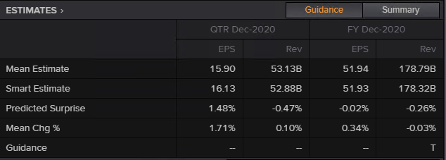 According to Zacks Investment Research, the report will be for the fiscal Quarter ending December 2020, which is expected to experience a near quarter rally of its Earnings Per Share (EPS),compared to last year, at $7.47 from $6.47, which reflects a rise of 15% from the same quarter last year. The Reuters Eikon predict a $7.23 EPS, while the company’s revenue are seen between $119.7 billion (Eikon) and $121 billion (Zacks), after the revenues of $96.1 billion in Q3, with the yearly change seen at approximately 36% by the end of 2020.
