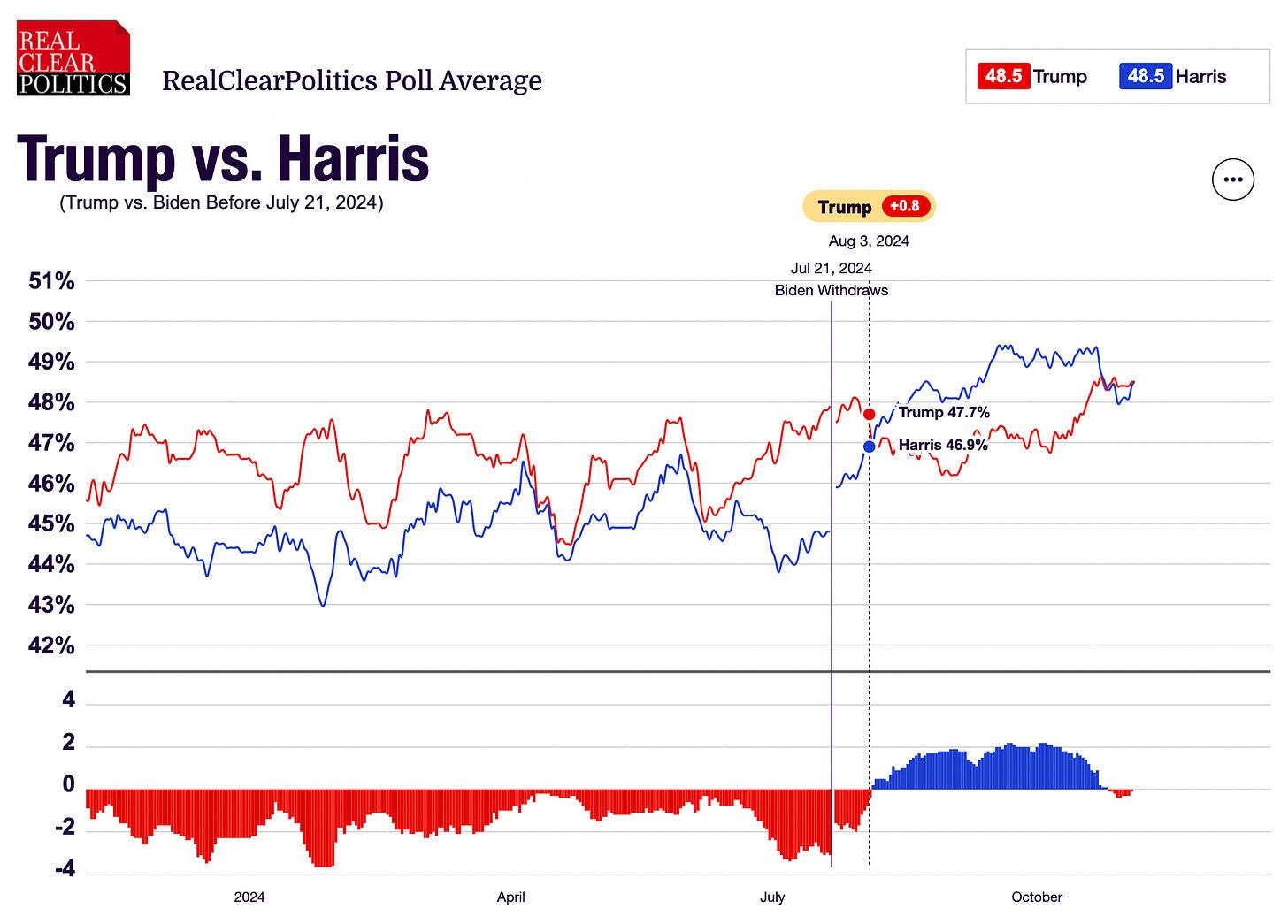 With positions locked and loaded, it’s time to hit pause on the opinion polls, grab some popcorn, and settle in for an Election Day thriller. This race is charging full speed to the Pennsylvania finish line, with RealClearPolitics showing Trump and Harris neck and neck. But Trump has a minuscule lead in the Keystone state, and the stakes couldn’t be higher—get ready for a nail-biter that promises to keep global markets on the edge of their seats.