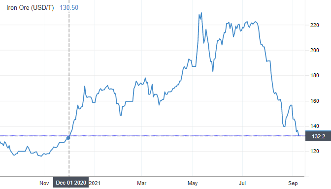 The price of Iron Ore is expected to remain somewhat robust for the remainder of 2021 before falling to US$100/T by March 2022. At least, according to Goldman Sachs and the Australian government's commodity forecaster. However, the forecasts available were made before the slowdown in the Chinese economy became undeniable. The drop in Iron Ore could come sooner rather than later.