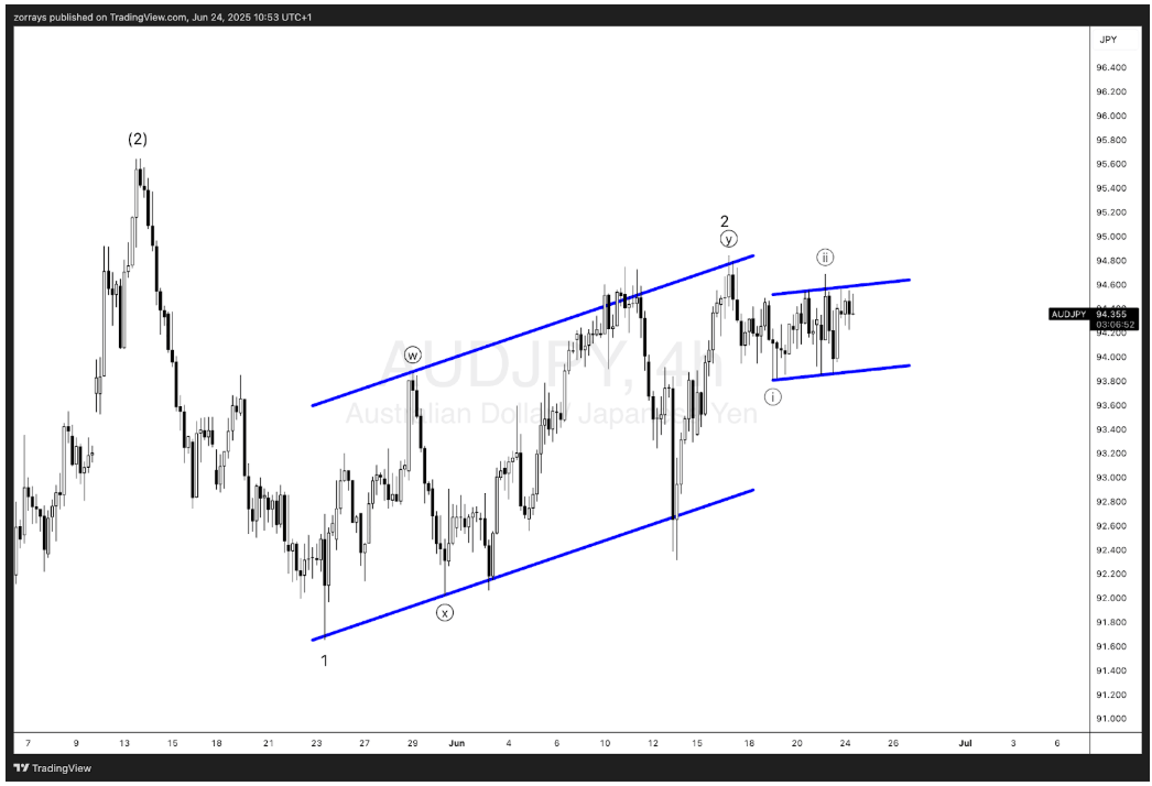The AUDJPY pair is offering a clean, high-probability Elliott Wave setup, with implications for a significant directional move as we move toward the end of June. The labelling on the 1H/4H chart suggests that the corrective wave structure has likely completed a larger degree wave 2 of (3), and price action now appears to be coiling within a smaller wave (ii) zigzag channel.