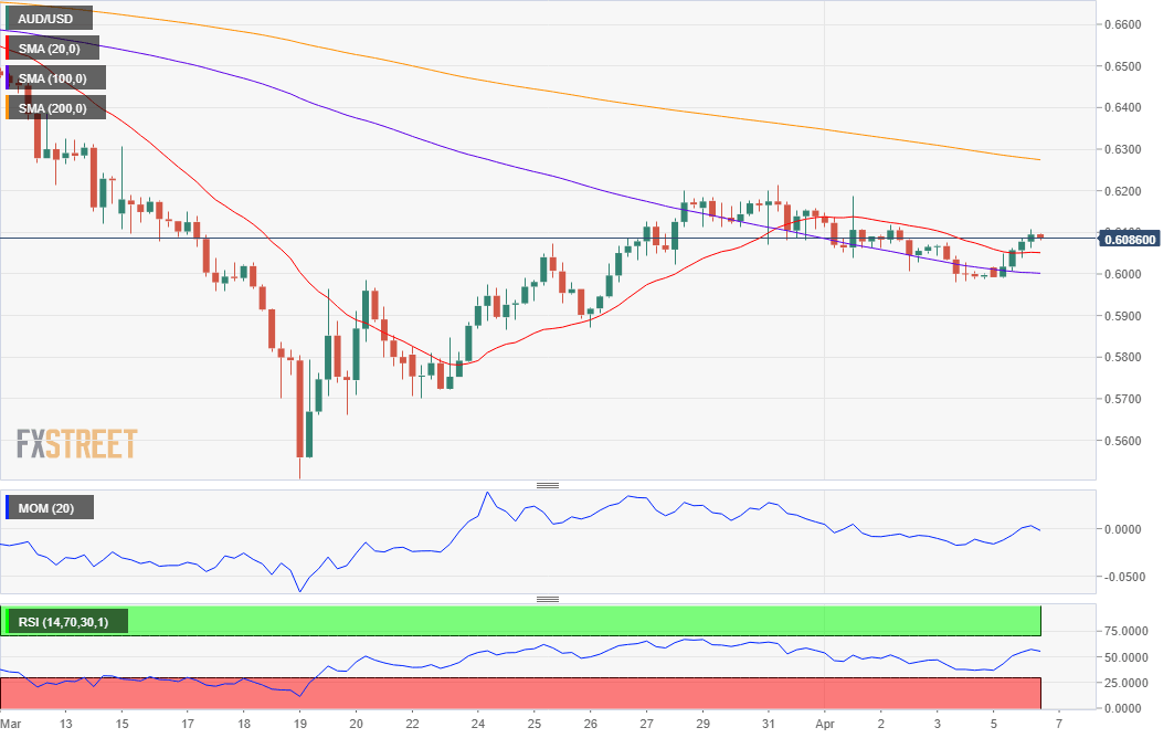 The AUD/USD pair flirted with the 0.6100 level at the beginning of the week, ending Monday around 0.6080. The Aussie advanced throughout the day following the lead of global equities, which surged on hopes there’s light at the end of the pandemic tunnel. The contagion curve has eased in Spain, Italy, and New York, and so did the death toll, although the improvement is far from encouraging. Anyway, it was enough to push investors into high-yielding assets.