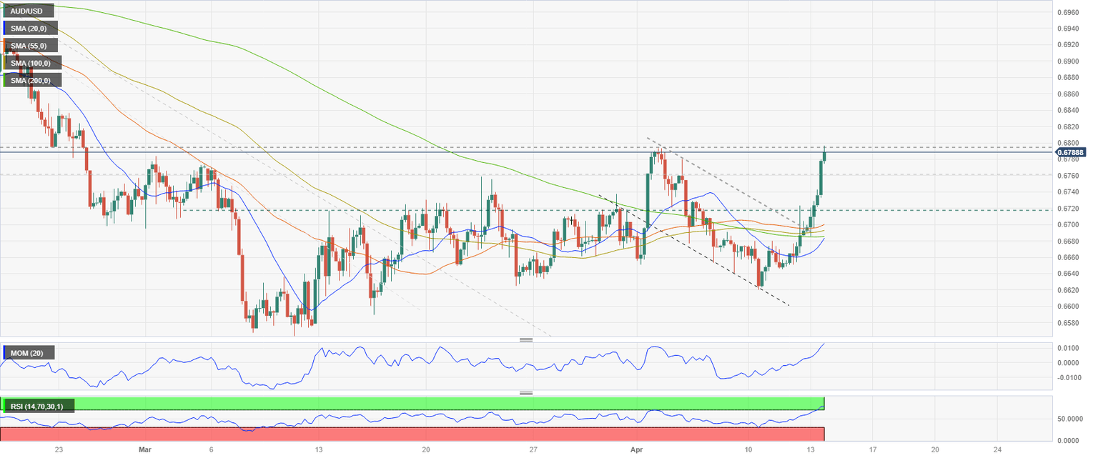 The bullish breakout in AUD/USD took place during the American session when it jumped above 0.6730 following the release of US economic data. Wholesale inflation dropped more than expected in March, and Initial Jobless Claims rose above consensus to monthly highs, pointing to a softer labor market. The US Dollar tumbled after those numbers, pushing AUD/USD sharply higher. More US economic data is due on Friday, with Retail Sales and Industrial Production.