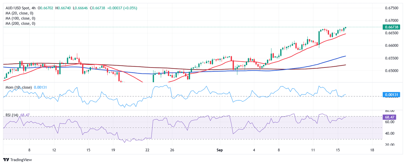 The daily chart for the AUD/USD pair shows it hovers around 0.6670, while maintaining the positive bias. The Momentum indicator consolidates well above its 100 line, while the Relative Strength Index (RSI) indicator advances near overbought readings, aiming to extend its advance. At the same time, the pair is trading above all its moving averages, with the 20 Simple Moving Average (SMA) picking up above the longer ones, currently at around 0.6540.