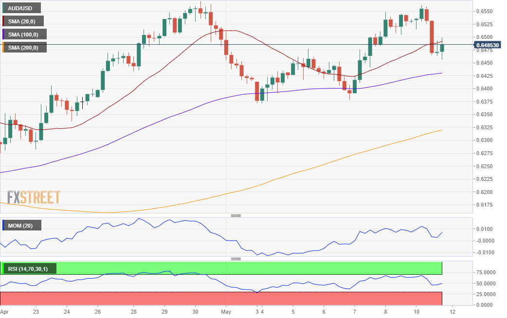 The AUD/USD pair peaked at 0.6560 but ended the day in the red around 0.6480, weighed by the sour tone of equities. Crude oil prices attempted to advance a couple of times throughout the day, but even after Saudi Arabia announced a voluntary cut of 100K barrels per day. Spot gold also eased, nearing $1,690 a troy ounce. Australia will publish this Tuesday the April NAB´s Business Confidence index, previously at -66. China will offer an update on inflation, with the CPI seen down by 2.6% YoY in April.