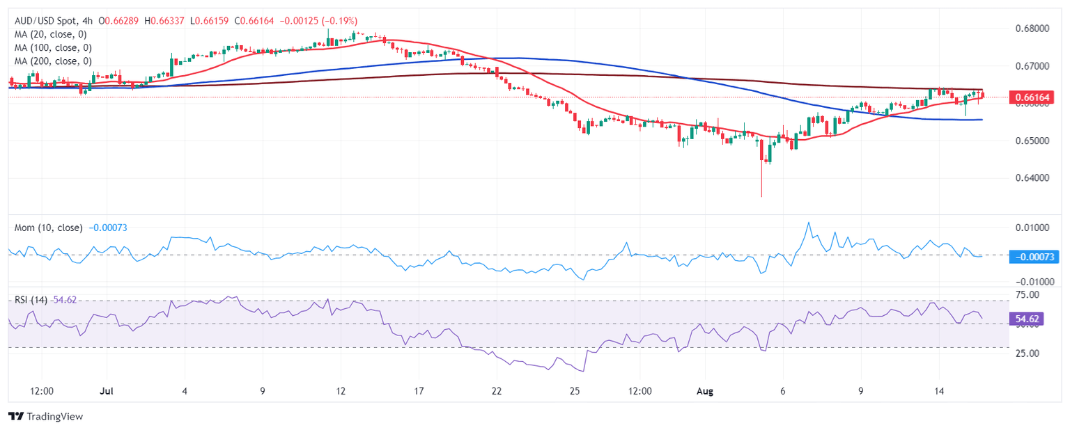 The 4-hour chart offers a near-term neutral stance. The pair is holding above a flat 20 SMA, but a directionless 200 SMA at around 0.6640 rejects advances since the beginning of the week. Technical indicators, in the meantime, turned south but hold above their midlines. The bearish pressure could increase if AUD/USD extends its slide below 0.6570, a strong static support level.