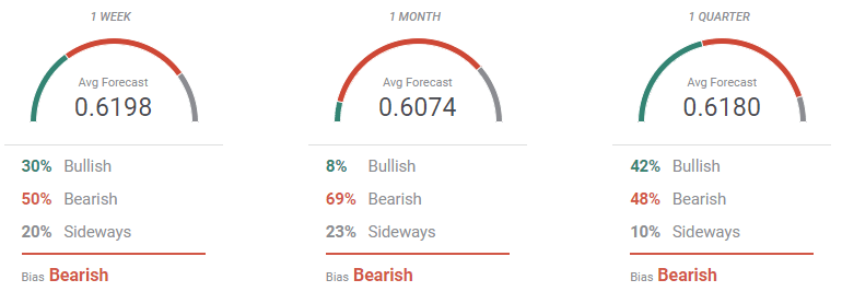 The FXStreet Forecast Poll shows that bears dominate AUD/USD, seen falling back toward 0.6000 in the next few weeks. The average target in the weekly perspective is at around 0.6200, but 50% of the polled experts are seeing the pair declining. Bears jump to 69% in the monthly view and decrease to 48% in the quarterly perspective when the pair is seen trading again around 0.6200.