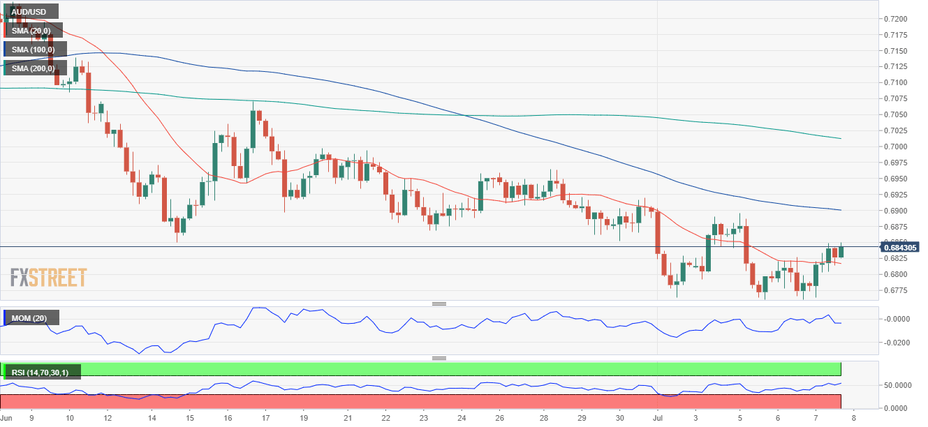 - AUD/USD is mildly bullish in the near term, could extend its gains towards 0.6900.