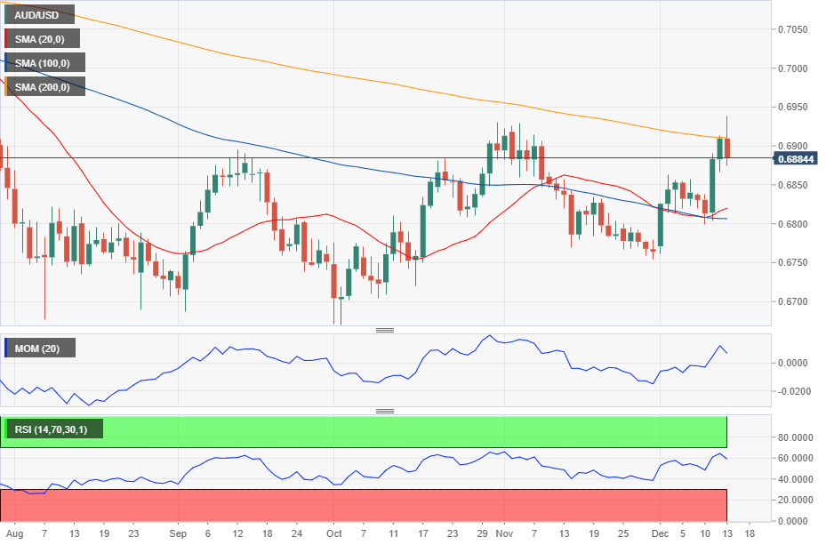 - AUD/USD bullish, up for a second consecutive week near 0.6900.