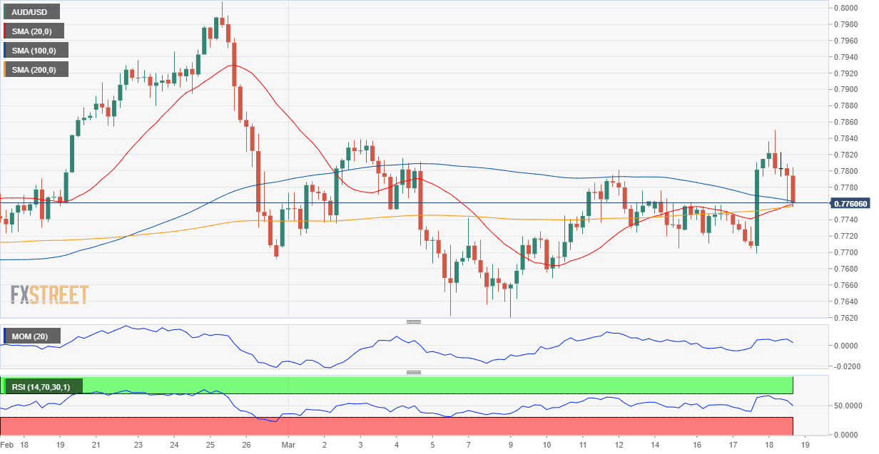 The AUD/USD pair trades near daily lows in the 0.7760 price zone heading into the Asian opening. The 4-hour chart shows that moving averages are confined to a tight 15 pips range, a sign of absent directional strength. The price is at the upper end of the mentioned range, while technical indicators turned sharply lower within positive levels, approaching their midlines. The risk has turned to the downside, with additional declines expected on a break below 0.7730, the immediate support.