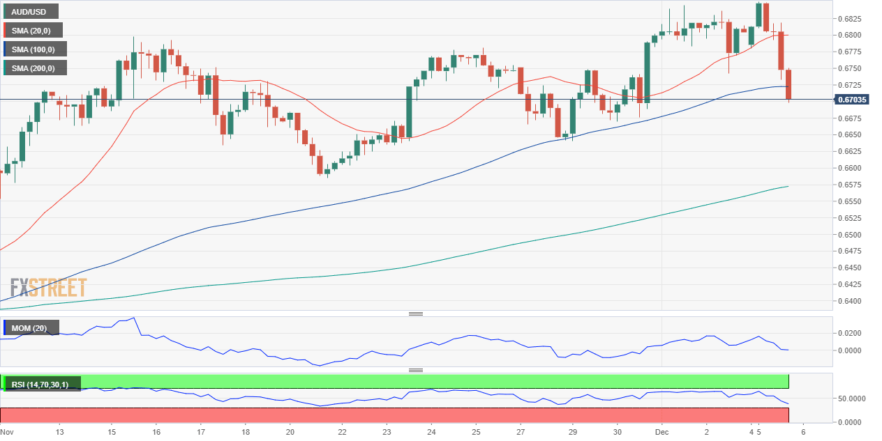 The AUD/USD pair ends Monday a handful of pips above a daily low of 0.6703, retreating sharply after surging to 0.6850 during Asian trading hours. The pair rallied on the back of the broad US Dollar weakness as a better market mood weighed on the safe-haven currency. However, the American currency recovered drastically following the release of upbeat US data, which weighed on stock markets and hence, the Aussie.